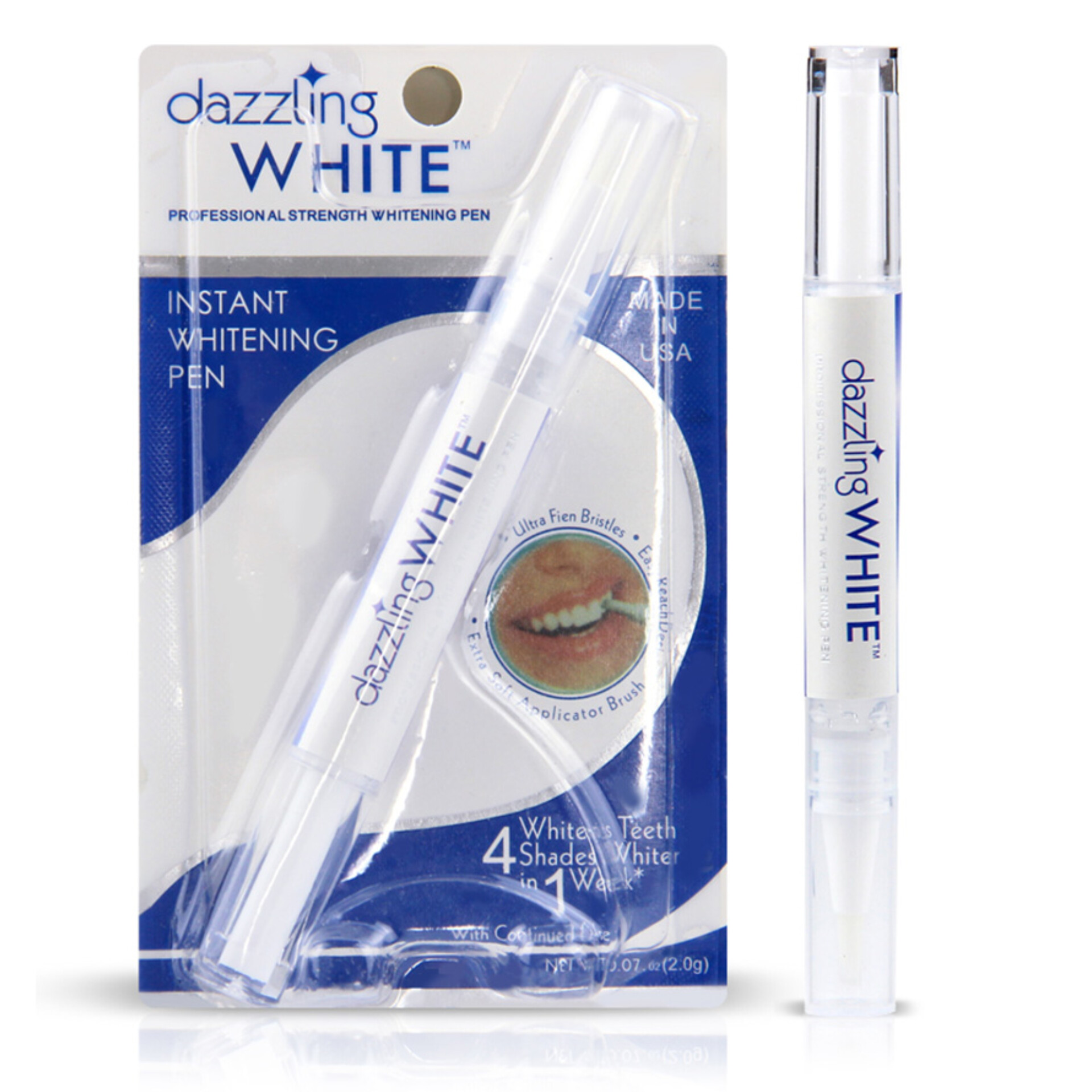 قلم سفید کننده دندان وایت دیزلینگ Dazzling White یکی از قلم های سفیدی فوری دندان ها است.استفاده از این قلم، ساده ترین راه برای سفید کردن دندان می باشد. این محصول به راحتی در مطب دندانپزشکی قابل استفاده می باشد. این روش، برای سفید کردن دندان بسیار اقتصادی بوده و همچنین کمک شایانی به سفیدکنندگی حرفه ای دندان خواهد کرد. نتیجه کار در این روش ماندگاری بالاتری خواهد داشت. قلم سفید کننده را می توان در هرجایی استفاده نمود. دلیل اصلی تیره شدن دندان ها، خوردن و آشامیدن مواد غذایی رنگین است. قلم سفید کننده، بدون هیچ اثر سوئی روی دندان، لبخندتان را زیباتر می کند. برای رسیدن به نتیجه مناسب، قبل از هر بار سفید کردن با قلم بایستی تمیز کردن حرفه ای دندان ها انجام شود. پیشنهاد می شود برای گرفتن نتیجه بهتر، از خمیر دندان سفیدکننده وایت دیزلینگ نیز استفاده شود. بنابراین استفاده روزانه از آنها هیچ اثر سایشی روی دندان نخواهد داشت. لاک فوری قلمی وایت دیزلینگ حاوی ژل سفید کننده به منظور سفید نمودن دندان ها و بر طرف نمودن لکه های غیر همرنگ بر روی دندان ها می باشد. این ژل غنی از زایلیتول و فلوراید می باشد که باعث تقویت مینای دندان می شود.